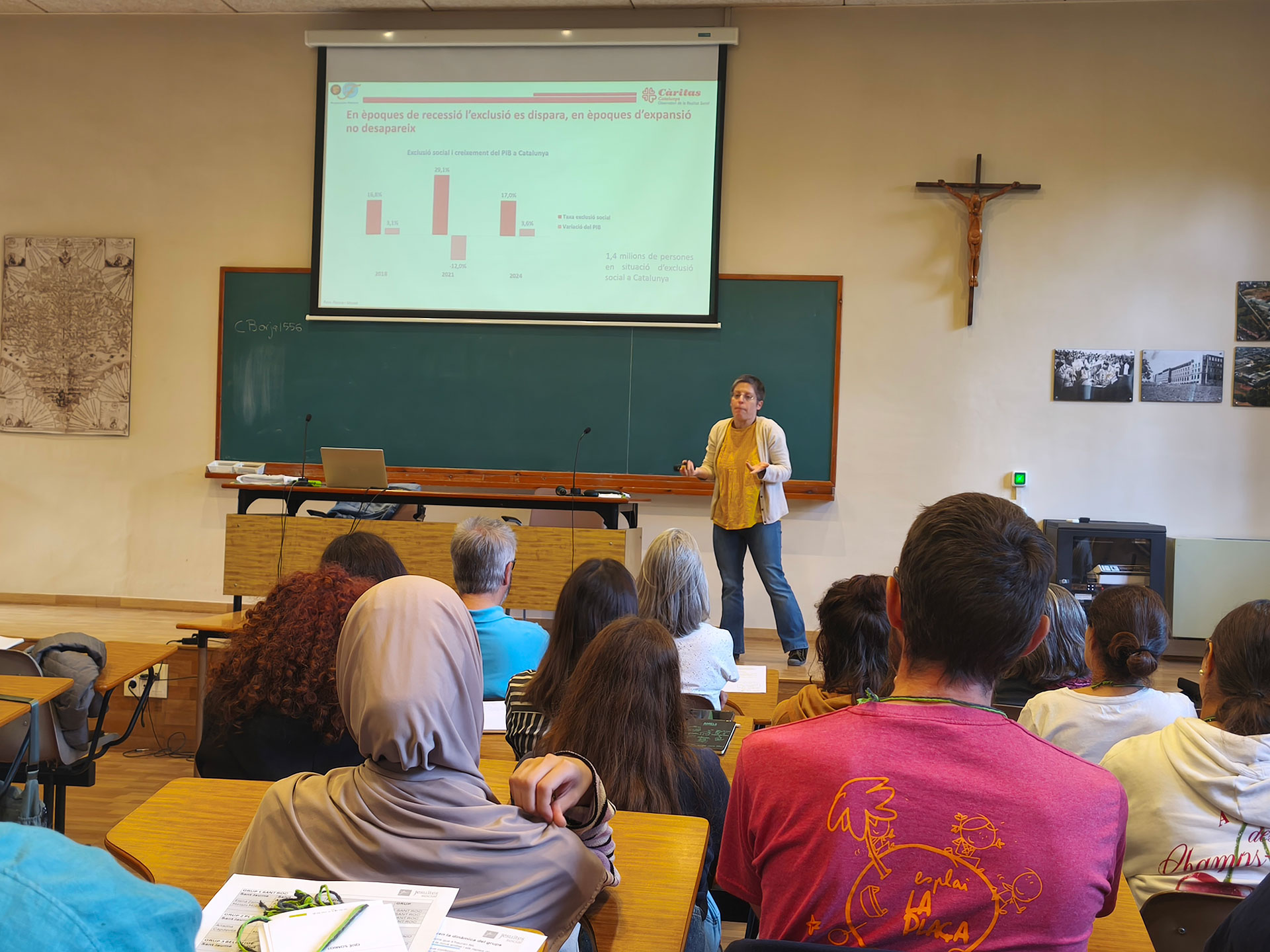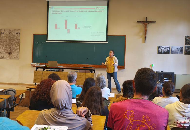 Tot i la recuperació econòmica general, la desigualtat persisteix a Catalunya, on l'exclusió social no només no desapareix, sinó que encara afecta 1,4 milions de persones, i és especialment greu per a les persones d'origen extracomunitari, per a les quals l'exclusió es triplica. Aquesta fragilitat es transmet entre generacions, ja que les dificultats econòmiques familiars dupliquen la probabilitat de caure en l'exclusió futura. La participació en activitats extraescolars esdevé un factor decisiu per trencar aquest cercle viciós. A aquesta problemàtica s'hi suma una emergència habitacional crítica que atempta directament contra la dignitat, la salut mental i el benestar de les famílies. Per fer front a aquesta realitat complexa, va insistir en la necessitat de cuidar la dimensió comunitària, reforçar la incidència política i treballar amb indignació i esperança activa.